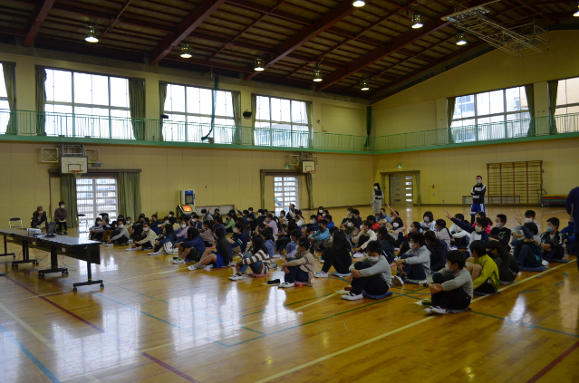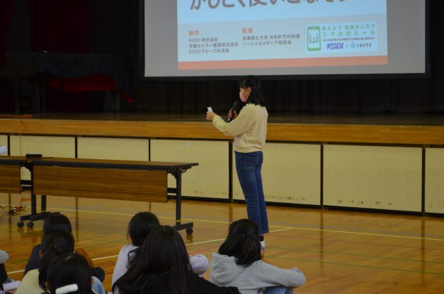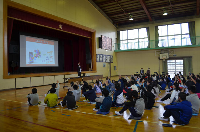参加した児童は、およそ200人で、NTTドコモの「ケータイ安全教室」の講師の方から、「SNSやコミュニケーションを使う場合注意する点」や、「スマホ・ケータイの使いすぎへの注意」等、説明とともに児童への質問等を交え,分かり易く講義をしてもらいました。
